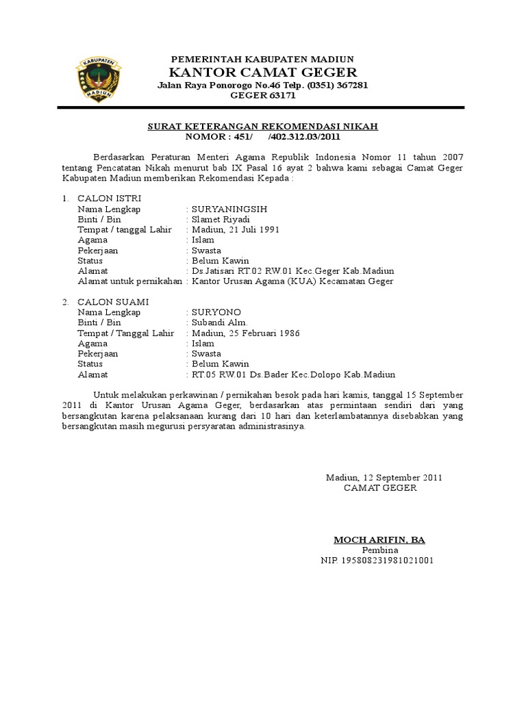 Contoh surat keterangan nikah siri dari desa have an image from the othercontoh surat keterangan nikah siri dari desa it also will feature a picture of a sort that may be observed in the gallery of contoh surat keterangan nikah siri dari desa. 451 402312032011 berdasarkan peraturan menteri agama republik indonesia nomor 11 tahun 2007 tentang pencatatan nikah menurut bab ix pasal 16 ayat 2 bahwa kami sebagai camat geger kabupaten madiun memberikan rekomendasi kepada. Contoh surat pernyataan nikah siri sebuah pernikahan yang dinyatakan resmi di indonesia haruslah diakui secara sah oleh agama maupun negara. Bagi calon pengantin yang hendak melaksanakan pernikahan bukan di wilayah asal atau pindah tempat nikah yang di luar kecamatan kota yang sesuai dengan alamat pada ktpnya maka perlu mendapatkan surat rekomendasi pindah nikah dari kepala kua setempat sesuai alamat ktp yang akan pindah. Contoh surat rekomendasi pindah nikah kua blimbing 2116 tidak ada komentar. Hasil keluaran dari proses ini adalah surat n1.