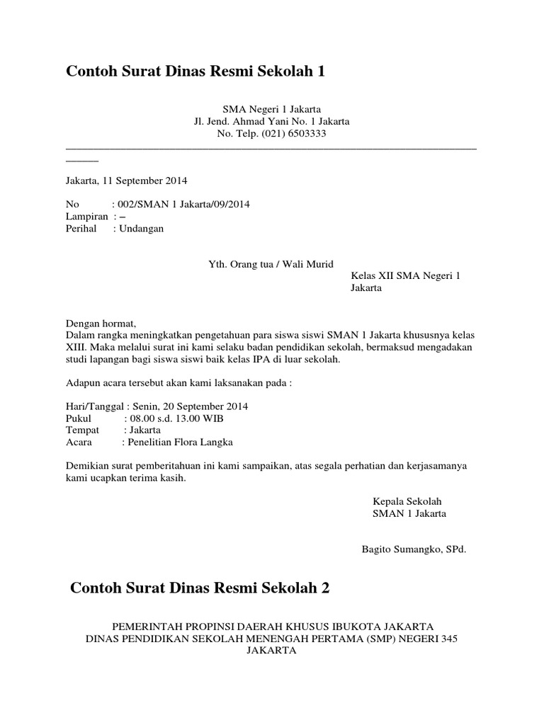 Jika anda adalah seorang karyawan atau staf perusahaan mungkin tertarik melihat artikel lainnya silahkan baca di contoh surat bisniskembali ke topik bahasan pada artikel kali ini akan. Seperti kegiatan sebuah perlombaan yang diadakan organisasi ekstrakulikuler di sekolah yang dimana sebelum mereka mengadakan perlombaan harus memiliki surat resmi yang akan diajukan kepada kepala sekolah sebagai permohonan dan menerangkan bahwa organisasi tersebut. Baik itu berupa surat resmi untuk komunikasi internal maupun untuk komunikasi eksternal. 15 contoh surat dinas resmi sekolah pemerintah perusahaan contoh surat dinas surat dinas merupakan surat yang dibuat oleh instansi atau dinas untuk berbagai kepentingan. Maka dari itu surat dinas sekolah disebut dengan salah satu contoh surat resmi. Contoh surat dinas resmi sekolah setiap kegiatan sekolah yang bersifat resmi biasanya disertai dengan dikeluarkannya surat resmi.