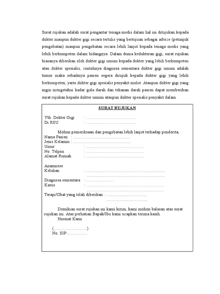 Contoh surat rujukan dokter gigi. Dalam dunia kedokteran gigi surat rujukan biasanya diberikan oleh dokter gigi umum kepada dokter yang lebih. Adapun keperluan surat dokter biasanya dipergunakan oleh perseorangan atas nama pribadi dan untuk kepentingan pribadi. 7 contoh surat dokter gigi. Setelah surat rujukan diberikan oleh dokter gigi melalui pasien kepada dokter gigi yang lebih berkompeten biasanya akan ada surat rujukan balasan yang berikan oleh dokterdokter gigi terujuk kepada dokterdokter gigi perujuk melalui pasien yang menyatakan bahwa telah dilakukan pengobatanperawatan atau jawaban advice dari dokterdokter gigi perujuk. 15 contoh surat dokter untuk berbagai keperluan dalam berbagai hal dan urusan surat keterangan dari dokter sangatlah diperlukan. 11 contoh surat dokter klinik.