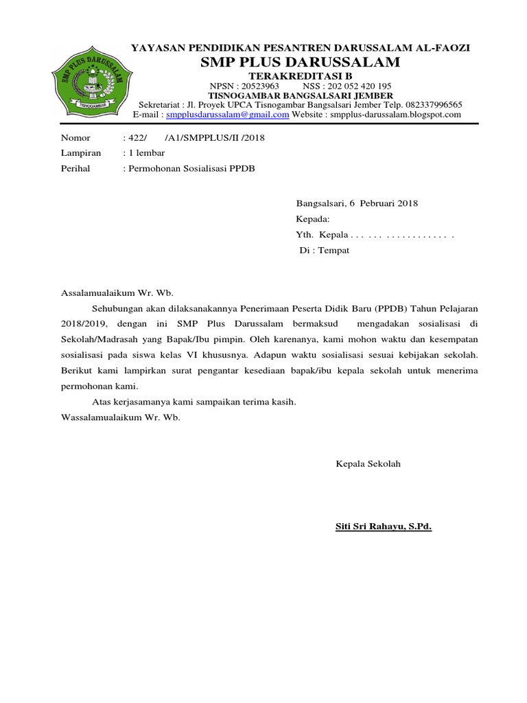 Contoh surat sosialisasi ke sekolah. Search inside document. Penggunaan surat resmi sekolah merupakan hal yang wajib bagi sekolah sebagai salah satu lembaga pendidikan. Academiaedu is a platform for academics to share research papers. Contoh surat undangan kita tahu surat undangan adalah sebuah tulisan di dalam kertas yang memuat ajakan kepada orang lain baik perorangan maupun kelompok untuk menghadiri kegiatan tertentu. You are on page 1 of 28. Contoh surat permohonan sosialisasi ppdb kop sekolah nomor.