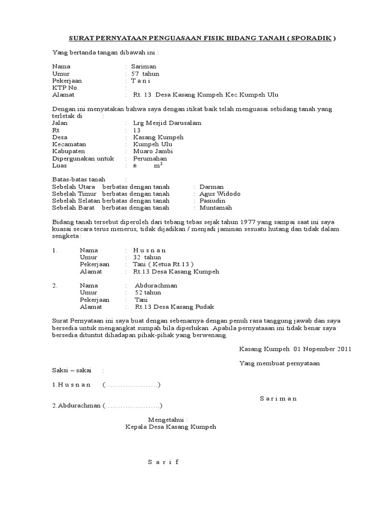 Adalah rangkaian kegiatan yang dilakukan oleh pemerintah secara terus menerus berkesinambungan dan teratur meliputi pengumpulan pengolahan pembukuan dan penyajian serta pemeliharaan data fisik dan data yuridis dalam bentuk peta dan daftar mengenai bidang2 tanah dan satuan2 rusun termasuk pemberian surat tanda bukti haknya bagi bidang2 tanah yang sudah ada haknya dan hak milik atas satuan. Contoh surat sporadik dan surat surat dinas surat dinas model surat sporadik surat tanah pelepasan hak. Kali ini kami hadir lagi dengan memberikan contoh surat pernyataan penguasaan fisik bidang tanahsurat ini merupakan surat pernyataan dari seseorang yang memiliki sebidang tanah. Surat pernyataan penguasaan fisik bidang tanah sporadik memang salah satu produk yang dikeluarkan oleh desa atau kelurahan yaitu dengan membubuhkan tanda tangan kepala desalurah di suratnya serta mencatatkan di buku register kelurahan. Surat pernyataan penguasaan fisik bidang tanah sporadik. Jujur saya sebenarnya tidak begitu bisa menjelaskan fungsi dari surat pernyataan penguasaan fisik bidang tanah atau sporadik ini sebab dari apa yang saya ketahui surat pernyataan penguasaan fisik bidang tanah atau sporadik ini seringkali di jandikan sebagai jaminan seperti layaknya sertifikat tanah.