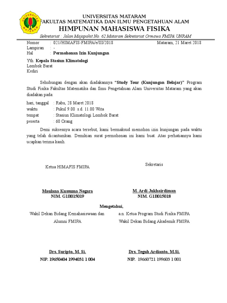 Contoh surat study tour mahasiswa. 0295 0001111 pati 11 januari 2018 nomor. Contoh surat resmi study tour dengan surat ini kami ingin memberitahukan kepada bapak ibu bahwa untuk menambah pengetahuan serta wawasan dan juga pengalaman yang berkaitan dengan ilmu pengetahuan dan teknologi untuk anak didik kami maka dari pihak sekolah ingin melaksanakan kegiatan kunjungan pendidikan study tour yang akan dilaksanakan pada akhir bulan april 2016. Berbicara study tour pada postingan ini saya akan berbagi administrasi sekolah terbaru yakni contoh surat pemberitahuan study tour tahun 2020 yang bisa anda unduh secara gratis. Itulah sebuah contoh surat pemberitahuan yang ditujukan kepada orang tuawali murid tentang pelaksanaan study tour yang dilaksanakan oleh sekolah. Sehubungan dengan diadakannya kegiatan di luar kota study tour kami selaku panitia penyelenggara ingin memberitahukan kepada masing masing orang tua wali mahasiswa untuk memberikan ijin kepada mahasiswa yang bersangkutan untuk ikut serta dalam acara tersebut. Maka dari itu surat dinas sekolah disebut dengan salah satu contoh surat resmi.