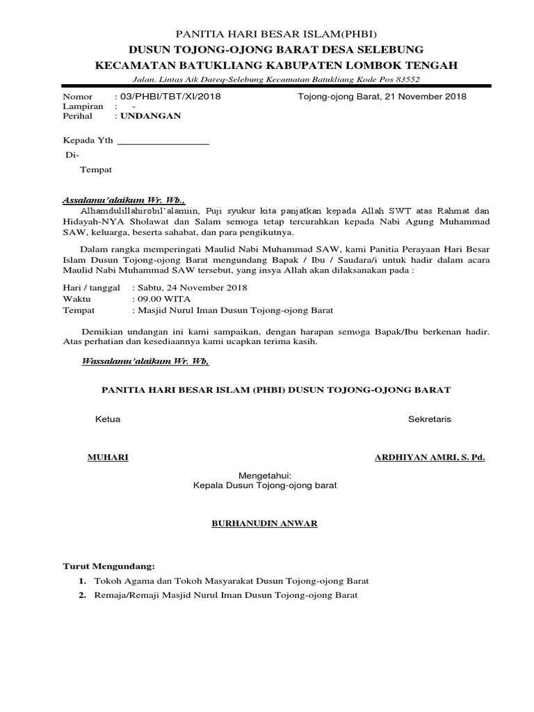 Pembahasan kita akan mempelajari cara membuat surat undangan tersebut dan juga sekaligus membahas satu contoh yang sudah disiapkan. Bahkan di beberapa kota maulid mendapat perhatian khusus dan menjadi acara besar besaran misalnya grebek maulid yang diadakan di yogyakarta. Saya merasa membantu sekali dengan contoh surat undangan maulid nabi muhammad saw seperti ini sangat bagus dalam penyampaiannya dan kata kata pembuka nya juga sangat mengesankan kunjung juga ke kantor unie ya. Contoh surat undangan pengajian rutin di berbagai kota peringatan ini biasa dirayakan dengan berbagai macam acara seperti lomba lomba keislaman bersholawat akbar termasuk diantaranya pengajian atau siraman rohani yang bertema maulid. Penutup yang berisi salam penutup nama dan jabatan yang mengundang dilengkapi dengan tanda tanggan. Perlu admin beritahukan bahwa portal website kumpulan contoh surat berisi contoh surat bisnis surat.