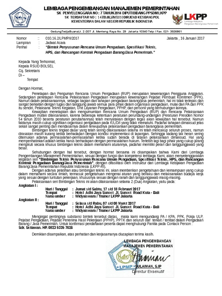 Pengeritian bimtek bagi aparatur sipil negera republik indonesia pengertian pelatihan bimbingan teknis bimtek adalah suatu kegiatan dimana para peserta diberi pelatihan pelatihan yang bermanfaat dalam meningkatkan kompotensi pereta yang dimana materi yang diberikanmeliputi membangun tim kerja efektif teknik komunikasi dalam konteks pelayanan prima survey indeks kepuasan masyarakat dan. Undangan ini dapat ditujukan kepada individuperorangan juga dapat ditujukan secara umum kepada publik. Dalam sebuah acara resmi seperti workshop dibutuhkan sebuah undangan yang resmi. Surat undangan berarti surat yang secara resmi dibuat untuk menghadirkan atau mengundang para peserta dalam hal ini adalah undangan bimbingan teknis. Contoh surat undangan resmi.