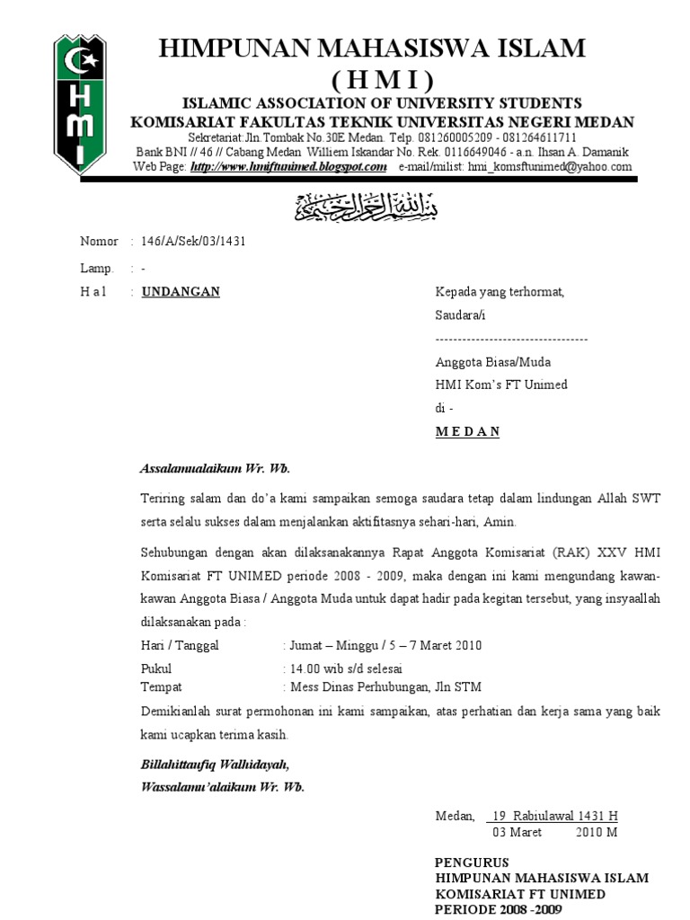 Rapat sendiri memiliki arti suatu kegiatan yang berisi diskusi guna membahas hal hal seperti merencanakan dan mengevaluasi sebuah kegiatan pada suatu tempat. Bersama ini kami sampaikan bahwa himpunan mahasiswa islam komisariat stai muttaqien purwakarta telah melaksanakan rapat anggota komisariat ke xiii yang pada acara tersebut telah terpilih ketua formateur hmi komisariat stai muttaqien purwakarta periode 2015 2016 yang selanjutnya bertugas menyusun kelengkapan pengurus hmi komisariat stai muttaqien dan menyiapkan pelantikan serta pengukuhan. Anda bisa mendownload atau mencetak gambar atau foto contoh surat hmi di bawah ini menggunakan printer. Contoh surat undangan kita tahu surat undangan adalah sebuah tulisan di dalam kertas yang memuat ajakan kepada orang lain baik perorangan maupun kelompok untuk menghadiri kegiatan tertentu. Contoh surat lengkap surat ijin surat lamaran kerja perintah resmi permohonan keterangan undangan dinas niaga jalan dukungan pengantar. Surat undangan dapat berupa surat resmi maupun tidak resmi.
