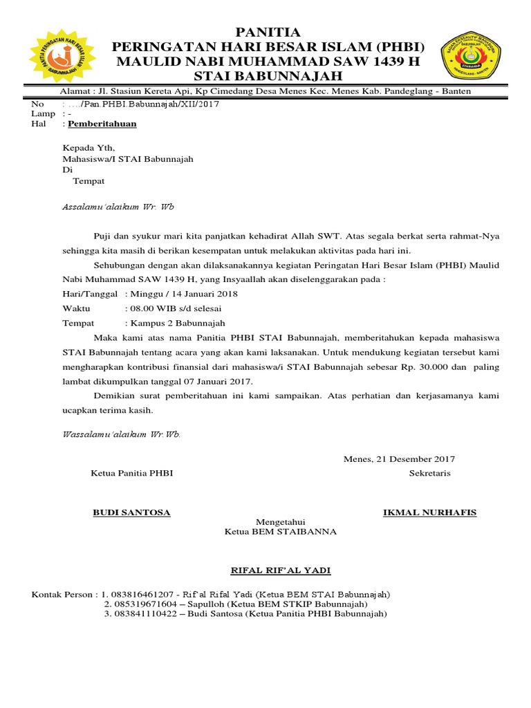 Contoh surat undangan phbi. Sedikit terlambat namun tak apalah yang penting belajar cara membuat undangan untuk acara peringatan maulid nabi muhammad saw esok. Contoh surat undangan acara peringatan maulud nabi surat undangan acara peringatan maulid nabi merupakan surat yang dibuat untuk mengundang dalam acara peringatan nabi muhammad seperti yang kita ketahui bersama maulid nabi merupakan peringatan lahirnya nabi muhammad sawyang biasa diperingati setiap tanggal 12 rabiul awal. Contoh surat undangan kita tahu surat undangan adalah sebuah tulisan di dalam kertas yang memuat ajakan kepada orang lain baik perorangan maupun kelompok untuk menghadiri kegiatan tertentu. Phbi maulid nabi besar muhammad saw mejid al falah. Beberapa contoh surat undangan ini ane ambil dari berbagai sumber yang menurut ane bagus dan baik untuk shobat tiru dari segi bahasa dan tulisan. Jadi sebuah kegiatan bisa berjalan lancar dengan adanya peserta sesuai dengan.