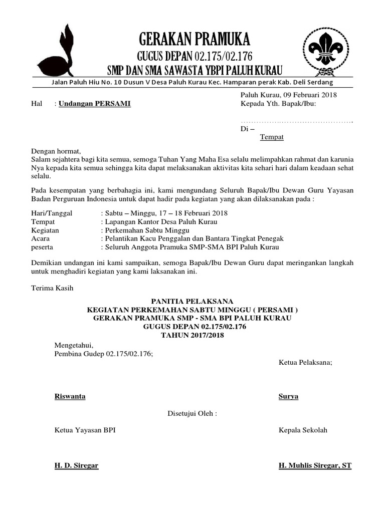 Contoh surat undangan kita tahu surat undangan adalah sebuah tulisan di dalam kertas yang memuat ajakan kepada orang lain baik perorangan maupun kelompok untuk menghadiri kegiatan tertentu. Di lapangan masih sering kali kita jumpai surat dari gugusdepan pramuka yang menggunakan kop kepala surat secara tidak baku atau tidak sesuai dengan ketentuan. Salam pramuka puji sukur atas. Contoh surat resmi undangan kegiatan pramuka. Keduanya memiliki karakteristik yang berbeda dan digunakan untuk keperluan yang tidak sama. Surat undangan dapat berupa surat resmi maupun tidak resmi.