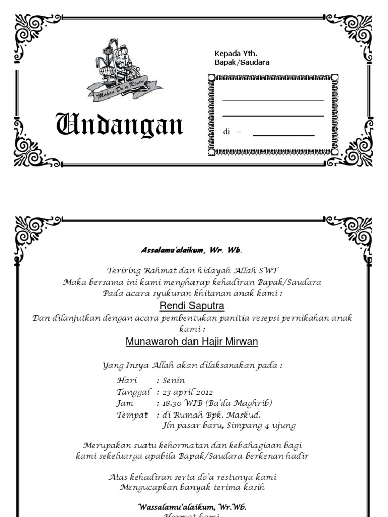 Contoh surat undangan syukuran khitanan. Contoh surat undangan khitanankata kata undangan khitanan unik ini berikut ini merupakan contoh kata kata undangan khitanan yang bisa kami bermaksud menyelenggarakan syukuran khitananini adalah undangan khitanan atau undangan sunatan yang dipesan oleh konsumen danicraft beberapa waktu yang lalu. Contoh surat undangan sunatan khitanan cara membuatnya bagi sebagian kalangan anak lelaki yang menginjak remaja dan baru saja di khitan atau disunat biasanya akan digelar acara syukuran dengan mengundang kerabat dan tetangga untuk makan dan berpesta. Tetapi untuk sementara admin akan bagikan format editing undangan khitanan yang bisa di edit menggunakan aplikasi corel draw terlebih dahulu. Kumpulan contoh surat undangan syukuran yang benar masih dalam kesempatan yang sama kami masih membahas informasi seputar contoh surat pastinya untuk anda pengunjung situs ini pasti sudah membaca berbagai macam contoh dan jenis surat undangan yang kami bahas dikesempatan sebelumnyadalam kesempatan ini kami akan membahas informasi tentang contoh surat undangan mungkin anda semua sudah. Dalam perayaan acara khitanan untuk anak kita perlu di ketahui beberapa hal hal. Contoh surat undangan syukuran dalam kesempatan ini kami akan membahas informasi tentang contoh surat undangan mungkin anda semua sudah.